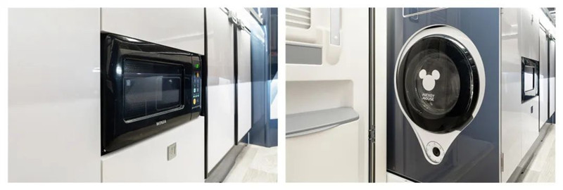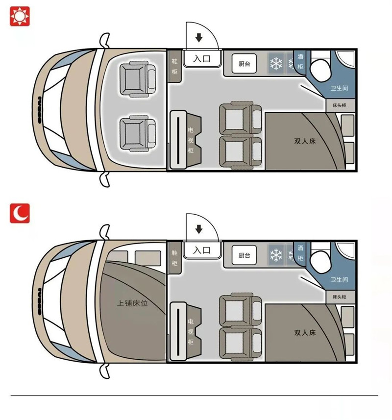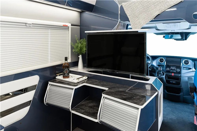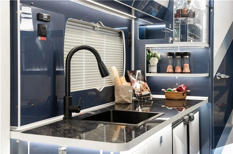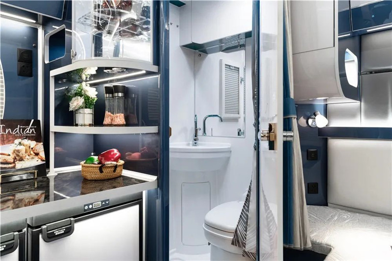厨房区的旁边就是独立式洗浴间,其内采用了干湿一体式设计,整体使用吸塑防水处理,配备了双向防雨换气扇、集成式豪华卫浴系统+恒温混水阀、高亮浴室镜、房车专用洗手盆+水龙头等。配备进口抽拉盒式马桶(黑水箱 18L),舒适无忧。