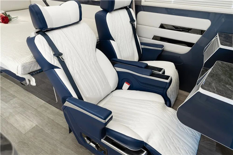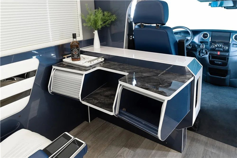 会客区的两张航空座椅是亮点,具备电动六项调节以及通风、加热、按摩功能,宽大的包围式头枕带来极佳的长途乘坐体验。座椅前方设计了一台隐藏式32寸电动升降智能电视,上升时科技感满满,下降之后与桌面融为一体,平坦的桌面可用于日常置物、办公。上方布置了三段式储物柜,方便放取随身物品。卡座区设置手机无线充电+升降插座,充电用电十分人性化。
